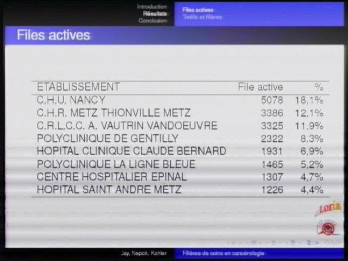 Le plan cancer mis en place par le gouvernement propose entre autre le fonctionnement des acteurs de soins, l'évaluation des réseaux, un système d'information et des méthodes pour explorer les trajectoires de soins. Il n'y a pas encore de système d'information en Lorraine. La première solution est le PMSI pour détecter des filières de soins : cependant on assiste à une explosion combinatoire. C'est pourquoi on utilise un treillis de Gallois : cet outil de fouille de données est performant pour l'extraction de connaissances, les grands volumes de données, et la puissance de visualisation.