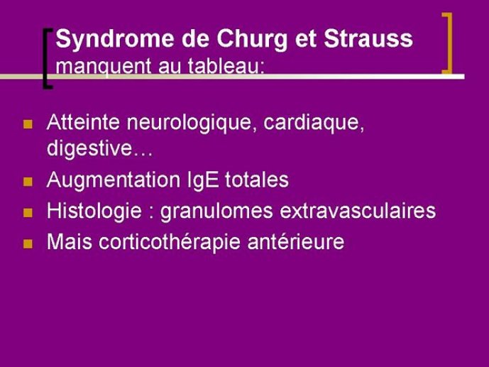 Cas d'une patiente jeune, souffrant de rhinite allergique, va installer un asthme sévère , instable, corticothérapé, avec différents traitements. On a conclu au syndrome de Churg et Strauss avec hyperéosinophilie majeure.