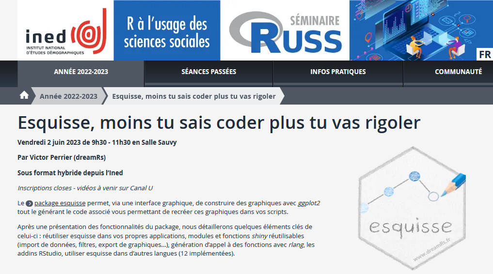Après une présentation des fonctionnalités du package, quelques éléments clés de celui-ci seront détaillés : réutiliser esquisse dans ses propres applications, modules et fonctions shiny réutilisables (import de données, filtres, export de graphiques…), génération d’appel à des fonctions avec rlang, les addins RStudio, utiliser esquisse dans d’autres langues (12 implémentées).