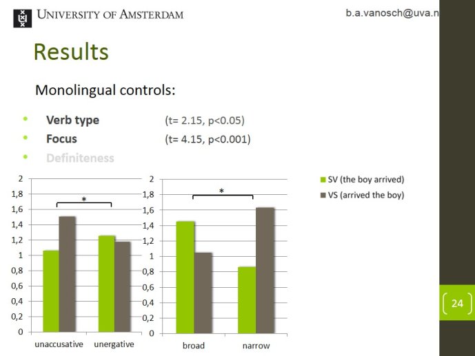 Acontextualized scalar acceptability judgment task was administered to 22heritage speakers of Spanish with Dutch as their dominant language and 18monolingual Spanish speakers. An example of a task item is shown in example 4.The results showed that the Dutch heritage speakers of Spanish overgeneralizedpostverbal, not preverbal subjects (figure 1). An adapted version of the task(the same design but different and slightly more items) was carried out with 24Spanish heritage speakers in Newark, New Jersey, with similar proficiency(based on a lexical decision task and self-ratings). These speakers did notovergeneralize either order (figure 2). Preliminary data from elicitedproduction seem to confirm these findings. The different preference patternsbetween the two groups suggest differential effects of the dominant languages,providing support for the role of cross-linguistic influence.