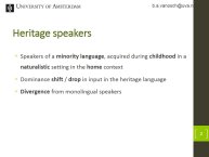 Whereasheritage Spanish is a popular topic of investigation in the US, much less isknown about heritage Spanish in combination with languages other than English(but see Irizarri van Suchtelen, 2016, and references there). The present studyoffers a relevant addition to the field by comparing two groups of heritagespeakers of Spanish in different countries: one group in the US and another inthe Netherlands.